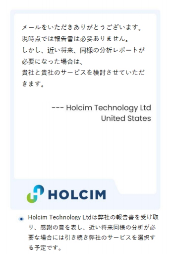 「メールをいただきありがとうございます。現時点では報告書を必要ありません。しかし、近い将来、同様の分析レポートが必要になった場合は、貴社を貴社のサービスを検討させていただきます。」