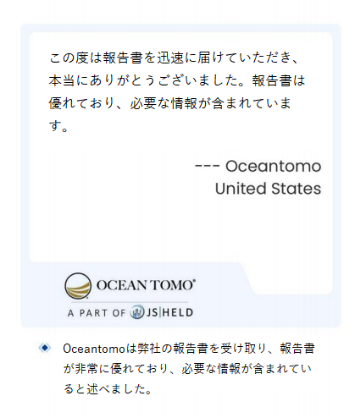 「この度は報告書を迅速に届けていただき、本当にありがとうございました。報告書を優れており、必要な情報が含まれています。」