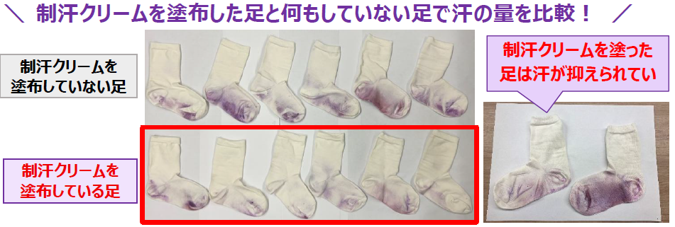女性6名を対象に、焼ミョウバン入り足指さらさらクリームの制汗効果を検証しました。朝、片足にのみクリームを塗布し、指定の靴下とスニーカーを着用して1日過ごした後、夕方にニンヒドリン反応実験キットで検証を実施。このキットは汗に含まれるタンパク質やアミノ酸と反応して青紫色に変化する特性を持ちます。検証の結果、クリームを塗布した足は、塗布していない足と比較して青紫色の反応が抑えられており、制汗効果が確認されました。