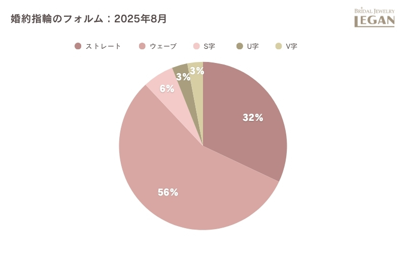 婚約指輪のフォルムは、ウェーブが一番人気が高く56%。ストレートのフォルムが32%でした。S字をご選択の方は6%、V字をご選択の方は3%、U字をご選択の方は3%いらっしゃいました。
