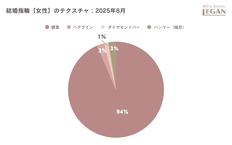 女性の結婚指輪のテクスチャは、婚約指輪同様に鏡面仕上げを選ばれる方が94%と圧倒的です。