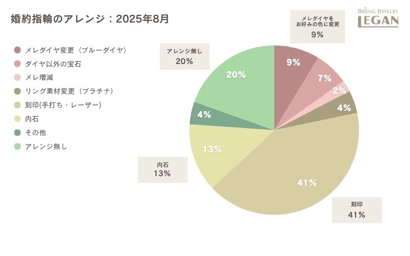 定番の名前や記念日などの刻印入れをされる方が、41%いらっしゃいます。その他リングの内側に宝石を入れる内石や、メレダイヤをお好みの色へ変更するアレンジが人気です。