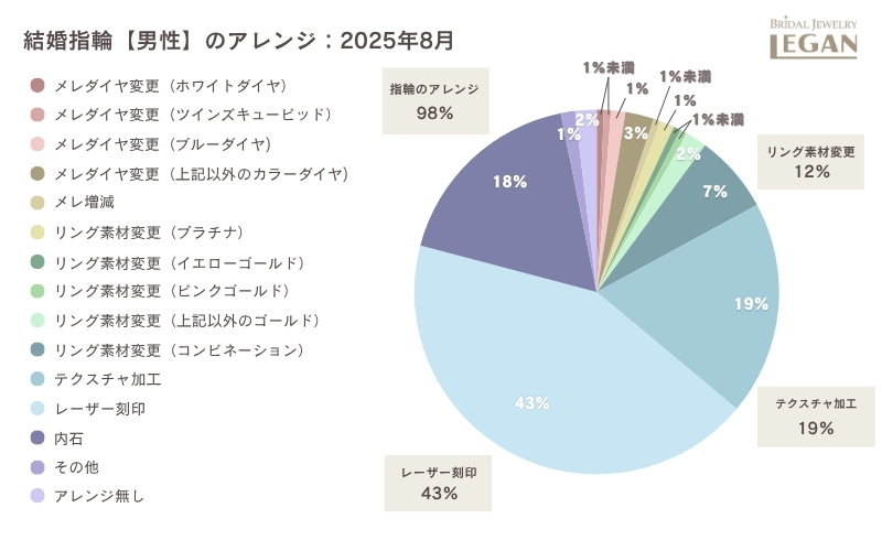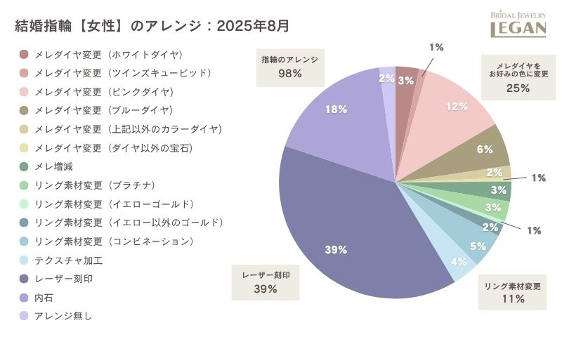 女性の場合、結婚指輪にアレンジを施す方は約98%に上ります。レーザー刻印が39%、内石が18%、メレダイヤにピンクダイヤを選択するアレンジが12%と人気です。