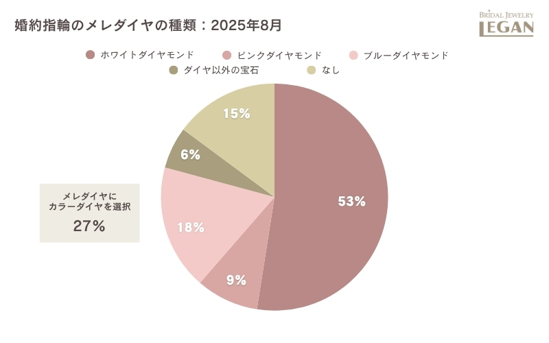 婚約指輪のメレダイヤの種類は、ホワイトダイヤが53%、ブルーダイヤが18%、ピンクダイヤを9%の方がご選択でした。全体の27%の方が、カラーダイヤをメレダイヤに選択されています。