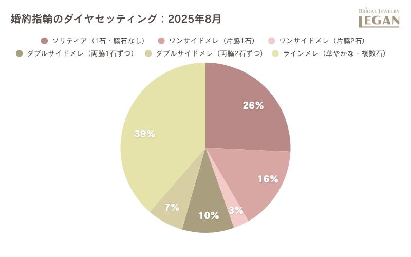 華やかな複数ダイヤのラインメレが39%と一番人気。続いて、ソリティア(1石・脇石なし)が26%、ワンサイドメレ(片脇1石)が16%、ダブルサイドメレ(両脇1石ずつ)が10%となりました。