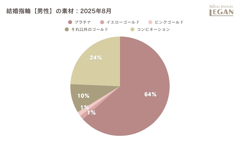 男性の結婚指輪の素材は、プラチナが64%ですが、コンビネーションも24%と人気です。