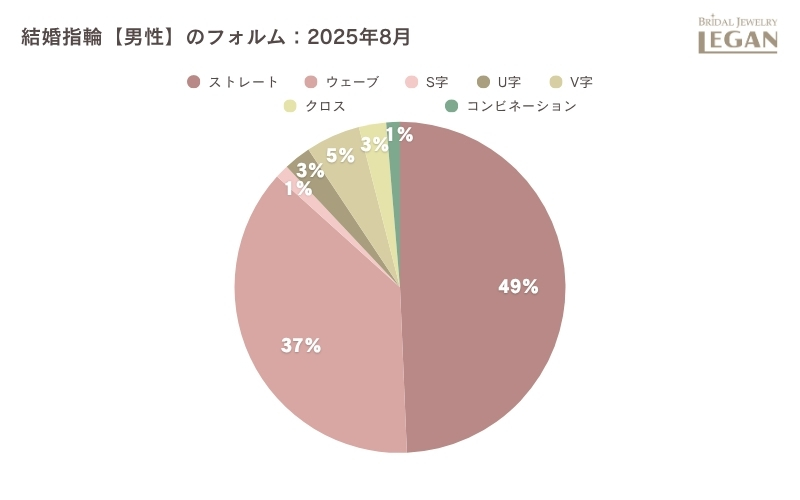 男性の人気フォルムは、ストレートが49%、ウェーブが37%と人気です。続いてV字が5%でした。