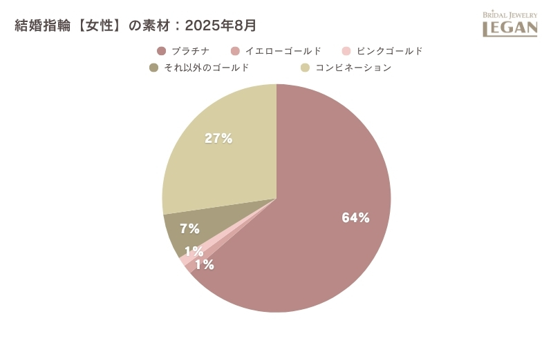 女性の結婚指輪の素材は、64%がプラチナと圧倒的に人気です。次いで、27%の方が様々な素材で組み合わせたコンビネーションを選択されています。
