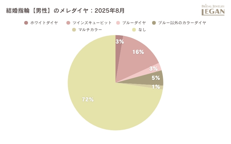 男性の結婚指輪は、メレダイヤを入れる方は全体の28%ですが、ツインズキューピッドなど様々なダイヤが選ばれています。