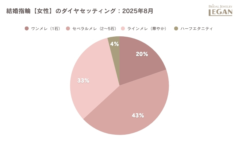 女性の結婚指輪のダイヤセッティングは、セベラルメレ(2~5石)が43%と一番人気。ラインメレを選択された方も33%いらっしゃいました。ワンメレ(1石)をご選択される方は20%と少数でした。