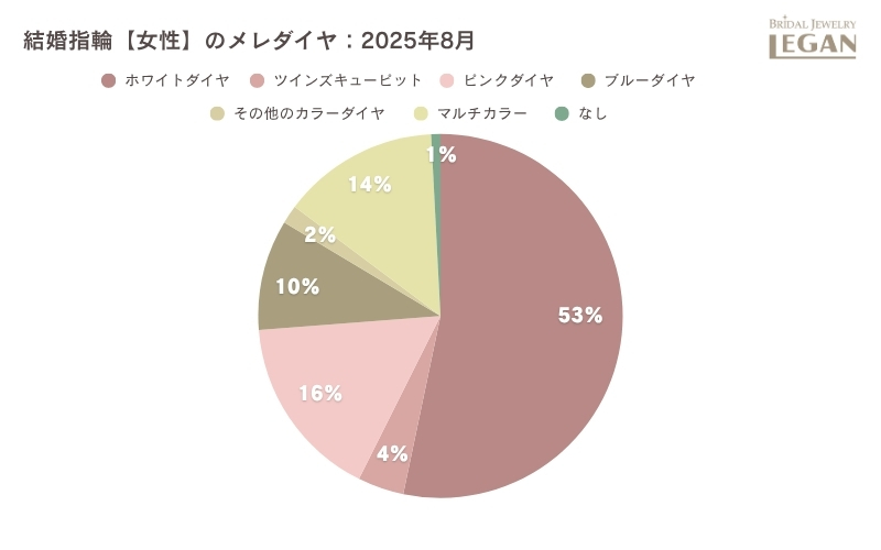 女性の結婚指輪は、ホワイトダイヤをメレダイヤに選ばれる方が53%。また、ピンクダイヤが16%、マルチカラーが14%と人気です。