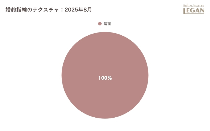 婚約指輪のテクスチャ(リングの表面加工)は、100%の方が鏡面仕上げでした。結婚指輪では、様々なテクスチャをお選びいただくこともありますが、「婚約指輪=鏡面仕上げ」というイメージをみなさんお持ちのようです。