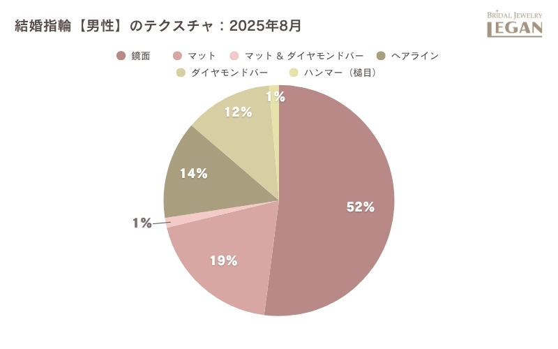 一方で、男性の結婚指輪のテクスチャは鏡面仕上げが52%に留まり、マット加工やヘアライン加工、ダイヤモンドバー加工などのテクスチャを楽しまれる方も多くいます。