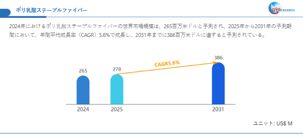 ポリ乳酸ステープルファイバーの市場規模、2031年に386百万米ドルに達する見込み
