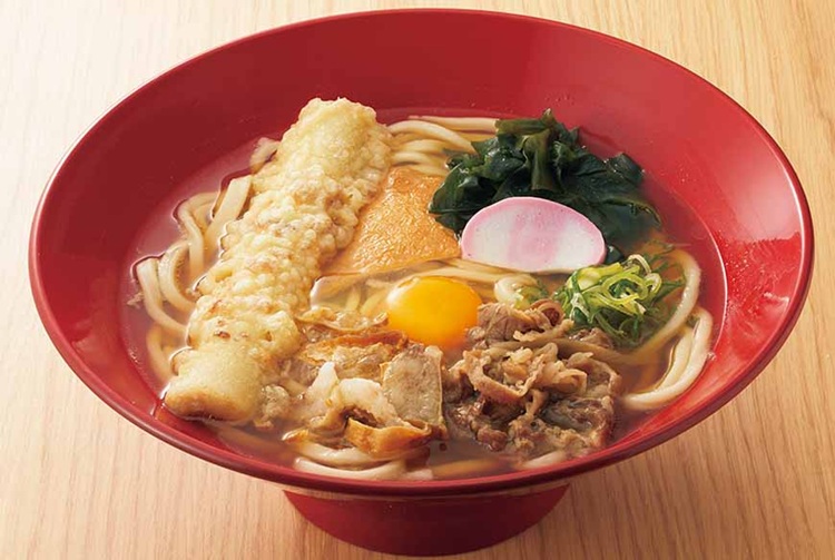 大判きつねあげ・大海老天・牛肉・たまご・わかめ・ねぎ・得かまぼこをのせた、得得の関西だしうどん。食べればほっとする、冬にぴったりの一杯。もちろん『うどん3玉同一価格』。