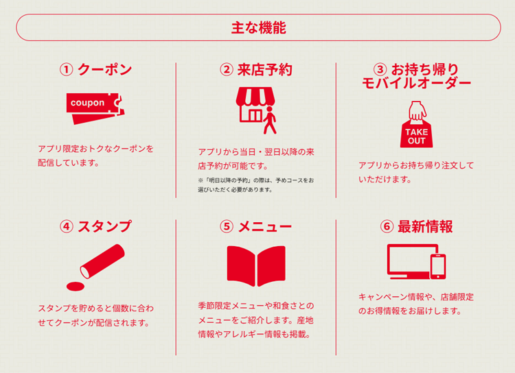 アプリ限定の『クーポン配信』がある他、来店ごとにポイントがたまる『スタンプ機能』、来店予約・お持ち帰り注文をアプリ内から直接行える『来店予約機能』『お持ち帰り注文』や、新メニュー・キャンペーン情報の発信、メニューの閲覧など機能充実です。