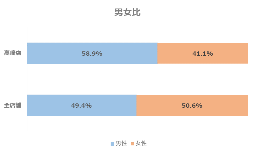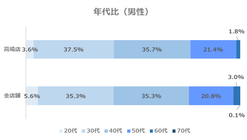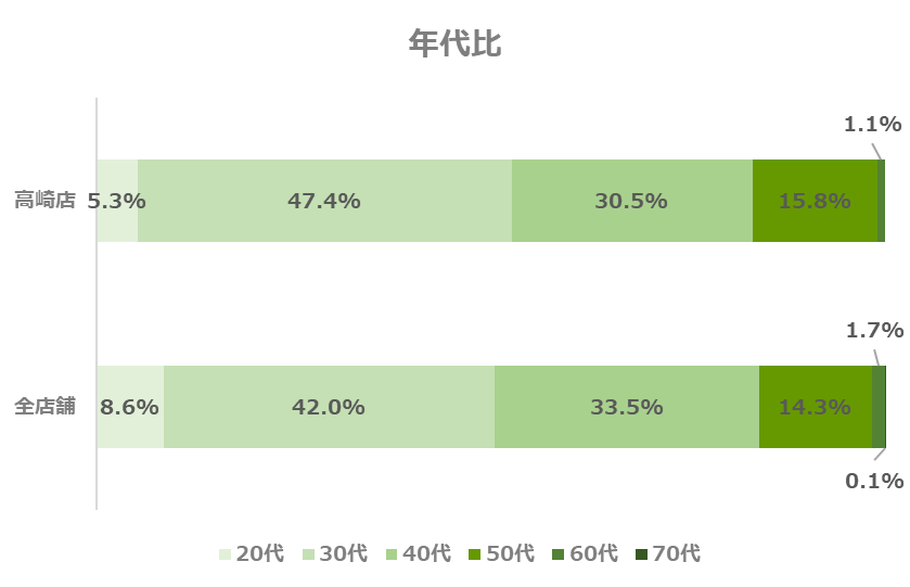 高崎店の年代別構成比については、全店舗と比べて20代と40代の割合がやや低く、30代の割合がやや高い傾向にあります。