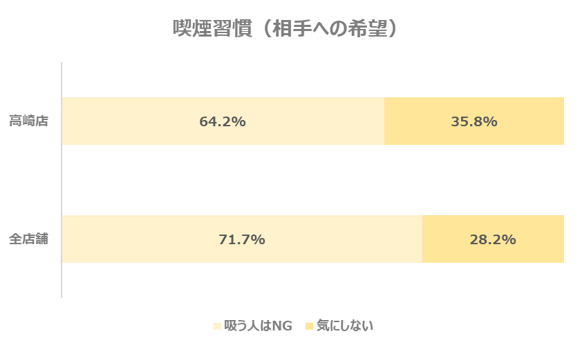 お相手に求める喫煙の習慣についてのデータを見てみると、「気にしない」と回答した割合は全店舗よりやや高い結果となりました。