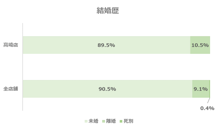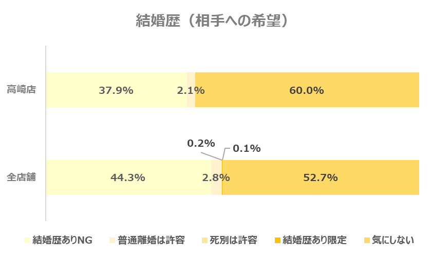 あわせて、お相手に求める結婚歴についてのデータを見てみると、「気にしない」と回答した方の割合は全店舗と比較して高い傾向にあります。