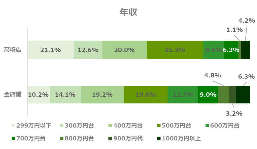 高崎店では、全店舗と同様に「年収500万円台」が最も多く、全体のおよそ4分の1を占めています。