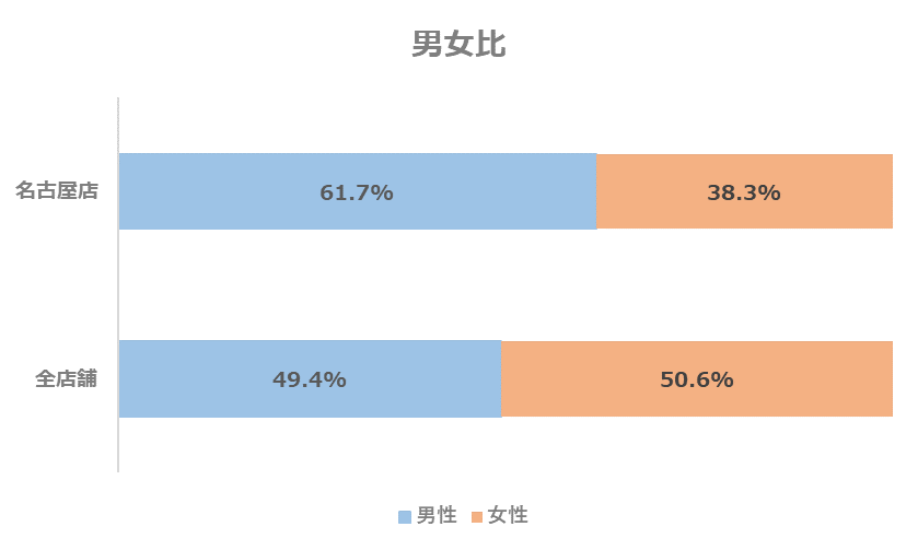 名古屋店の年代別構成比は、20~30代の割合が全店舗と比べるとやや高い傾向にあります。