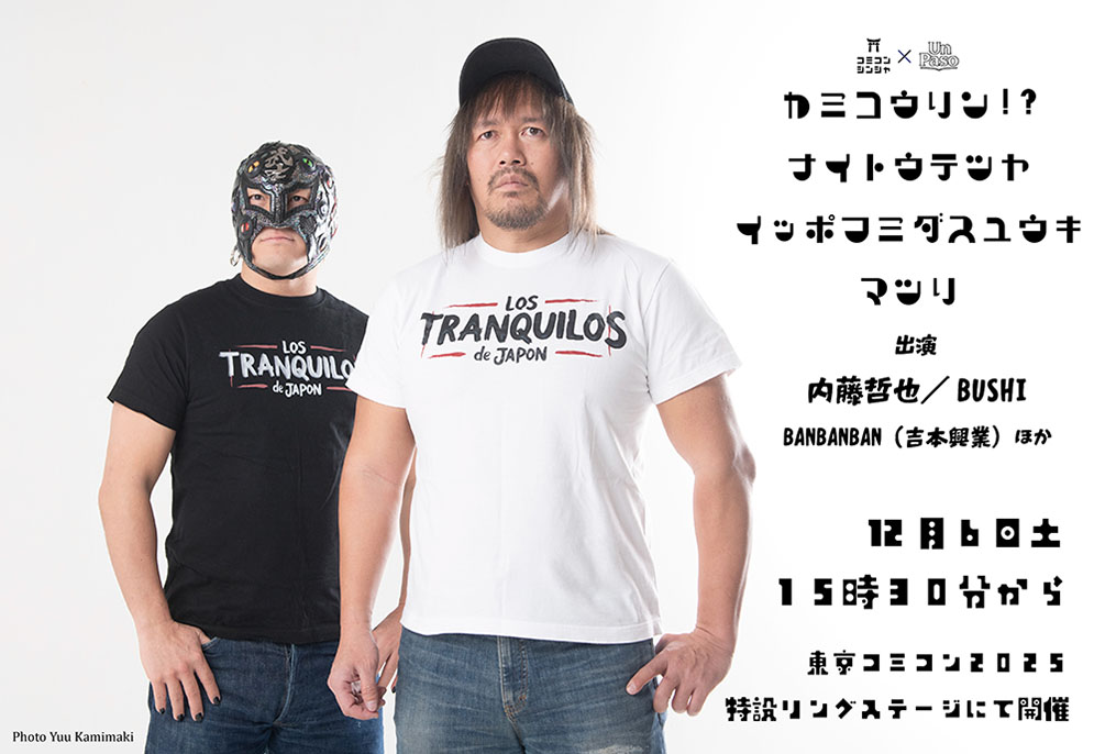本年5月、新日本プロレスを電撃退団し新たな一歩を踏み出した人気プロレスラー内藤哲也が、自らのユニット「LOS TORANQUILOS de JAPON(ロス・トランキーロス・デ・ハポン)」の盟友BUSHIとともに東京コミコン2025のリングステージに登場します。現在は世界各国からの要請で海外のリングにメインイベンターとして出場しており、日本のファンの前には久しぶりの登場となります。(ファンクラブイベントは除く)過去オープンイベントに登場することがほとんどなかった内藤哲也が、東京コミコンに出演することは「事件」といっても過言ではありません。今、内藤哲也は何を語るのか、どんな姿で登場するのか、プロレスファンのみならずコミコン来場者に大きなインパクトをあたえることでしょう。東京ドームに響き渡った、デ・ハポン コールが東京コミコンで聴かれるのか、答えはもちろん、トランキーロ! あっせんなよ!
