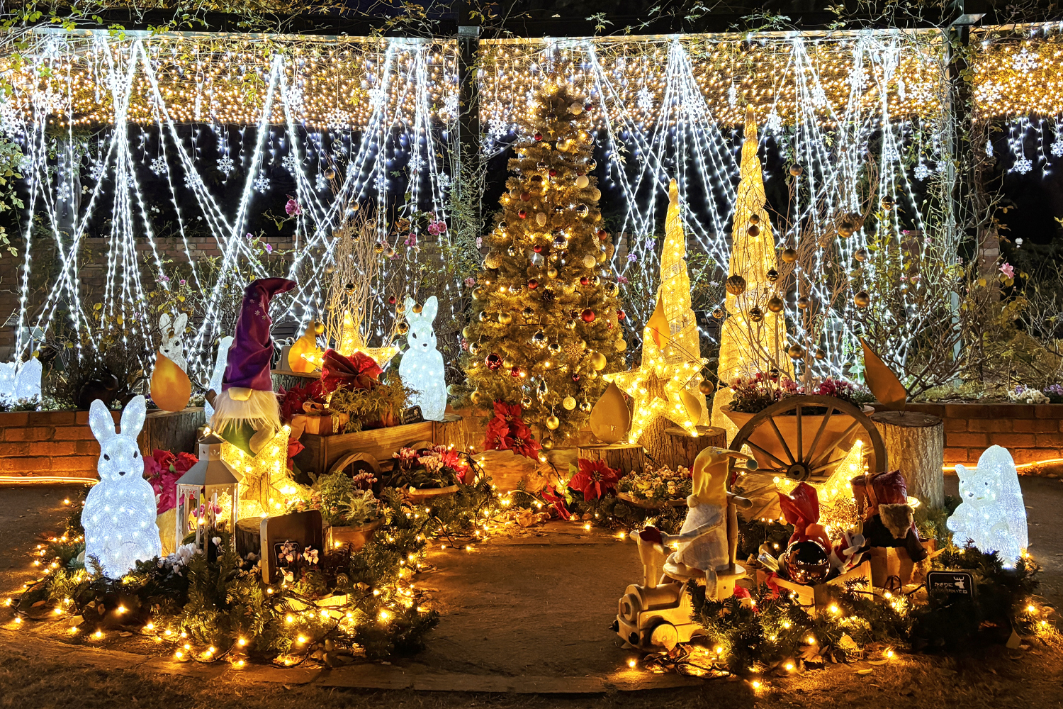 今年も四季の香ローズガーデンでは、温かな光のイルミネーションがガーデンを包み込みます。「香りのローズガーデン」では、お子さまに人気の動物や妖精のオブジェ、クリスマスデコレーションのフォトスポットが皆様をお迎えします。さらに星空のような無数のイルミネーションがパーゴラを華やかに彩る光の天井もお楽しみいただけます。冬ならではの草花とともに期間限定のイルミネーションをぜひお楽しみください。