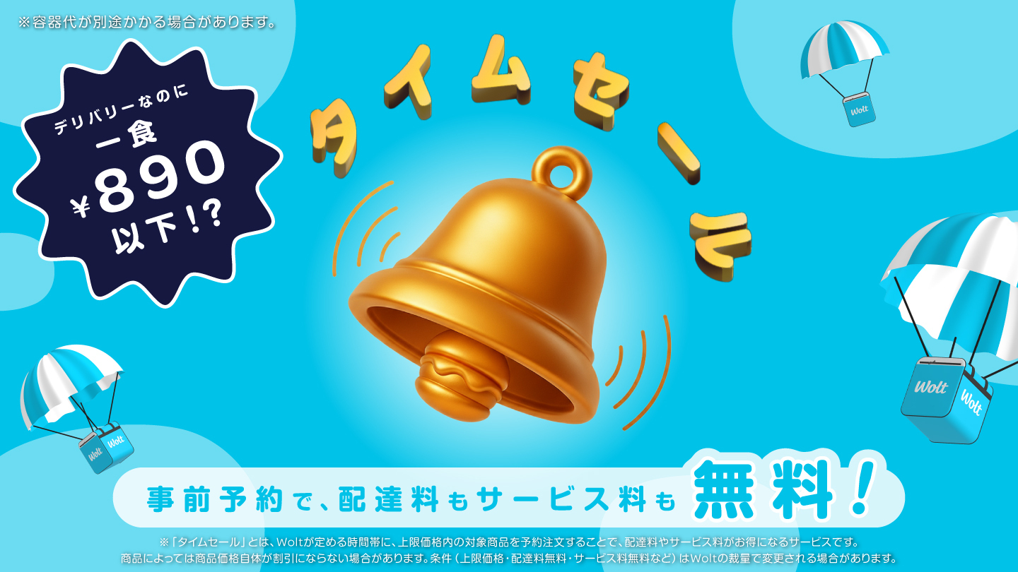 ※「タイムセール」とは、Woltが定めるタイムセール商品上限価格内の対象商品を、Woltが定める限定した時間帯に予約注文をすることで、配達料やサービス料がお得に注文できるサービスです。商品によっては、商品価格自体が割引になるわけではない場合がありますのでご注意ください。タイムセール商品の上限価格や配送料無料・手数料無料といった条件は、Woltが自己の裁量で変更する場合があります。