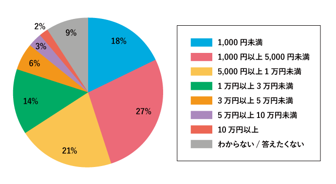 全国平均は12,906円で、第21位・北海道と第22位・大分県との間の数値です。また、1,000円以上5,000円未満と回答した人が一番多い結果となりました。