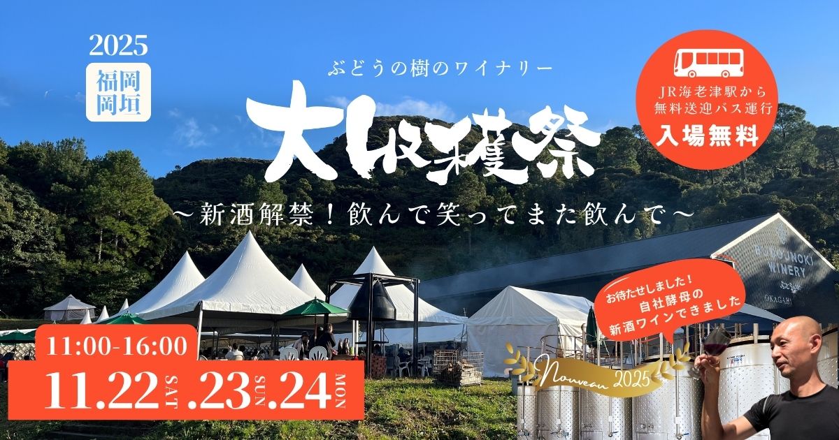 福岡県岡垣町の「ぶどうの樹ワイナリー」(運営:株式会社グラノ24K)では、 2025年11月22日(土)〜24日(月・祝)の3日間、秋の恒例イベント「ぶどうの樹ワイナリー大収穫祭2025」を開催します。 今年は、自社酵母で仕込んだ“オール福岡・岡垣ワイン”がついに完成。 限定1,000本の新酒ヌーヴォーをお披露目するほか、ぶどうの樹グループの惣菜・菓子・パン工房が集結し、 「大収穫祭マルシェ」やワインに合うグルメブース、デイキャンプ体験、抽選会など、 多彩なコンテンツをお楽しみいただけます。