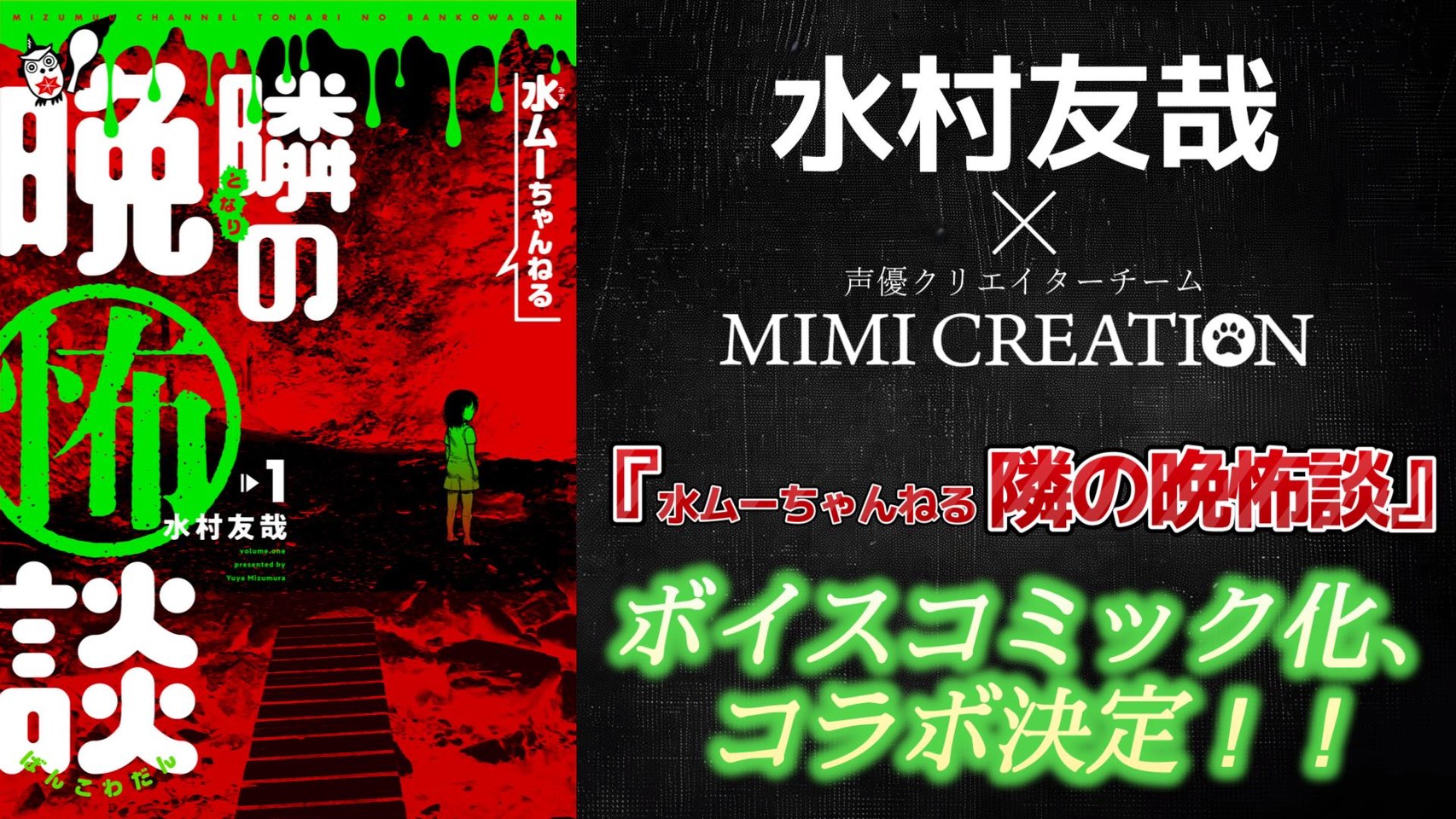 声優クリエイターチーム「MIMICREATION(ミミクリエイション)」(運営:株式会社KANOH)は、漫画家・水村友哉による人気ホラー作品『水ムーちゃんねる 隣の晩怖談』とのコラボレーションで、同作品のボイスコミック化を決定しました。