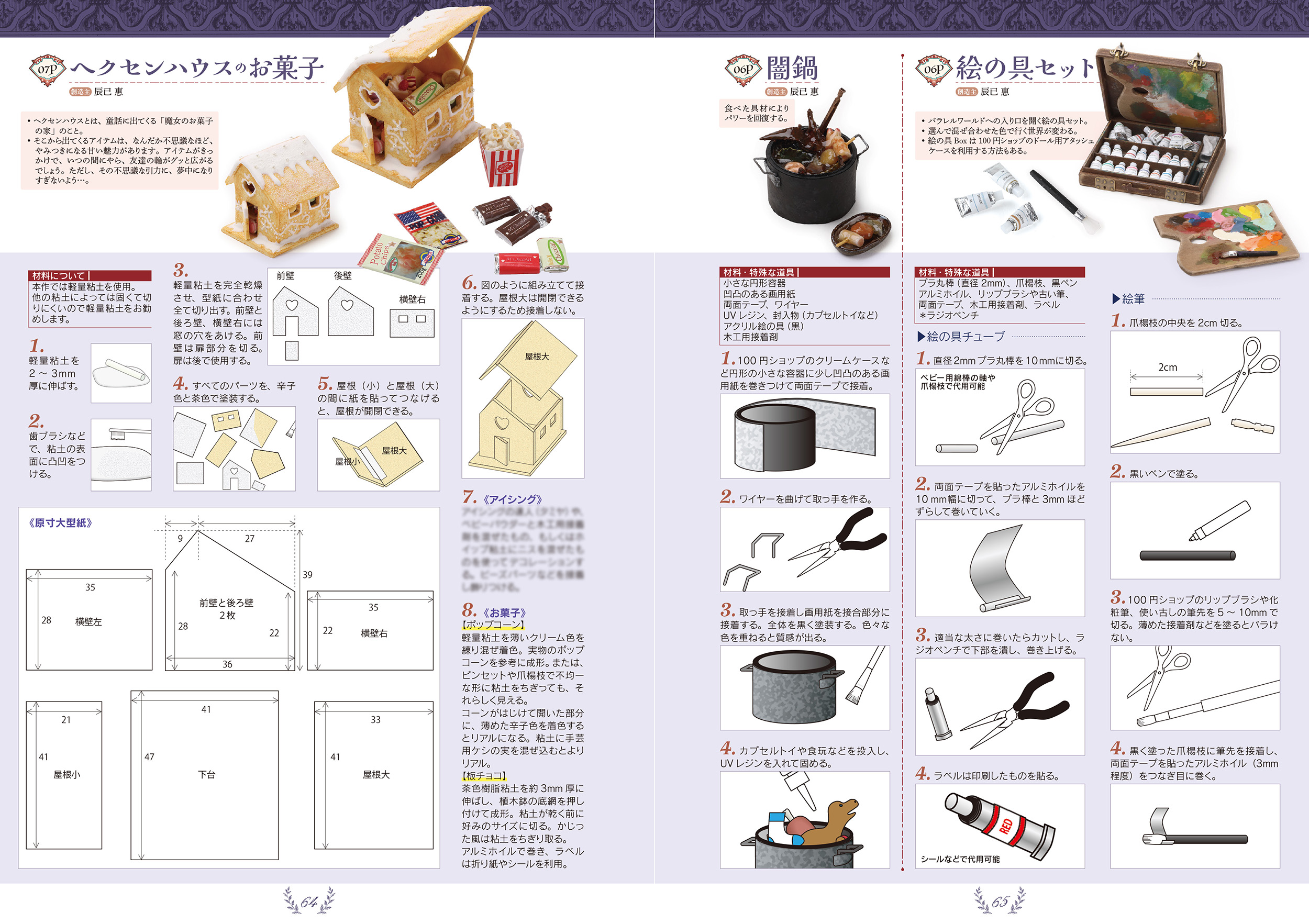 ストーリー仕立てのゲームブック形態で読者の選択により物語が変化し、ミニチュア作家がつくったアイテムやキャラクターが登場。異世界アイテムの技法はもちろん、アーティストの想像力と創造性を楽しむことができる。
