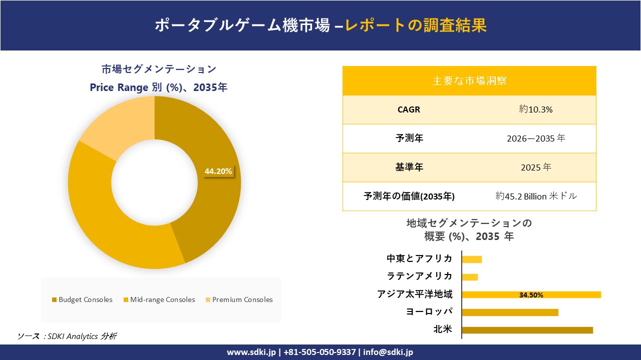 東京都渋谷区、2025年10月31:SDKI Analyticsはこのほど、「 ポータブルゲーム機市場に関する調査レポート : 予測2025―2035年」を発行しました。調査レポートは、 ポータブルゲーム機市場の成長に貢献する統計的及び分析的アプローチに焦点を当てています。当社の読者は、現在の市場シナリオに関する明確なイメージを得るとともに、詳細な調査レポートで提供される主要な業界の洞察から将来の傾向についても理解します。ポータブルゲーム機市場に関するこの調査レポートは、一次調査方法と二次調査方法の両方を利用して、市場の成長に伴う現在及び将来の市場傾向を分析します。