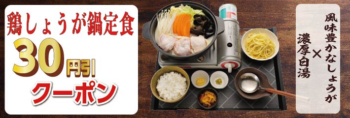 宮本むなし公式アプリでは、11月18日まで何度でも使える「白湯仕立ての鶏しょうが鍋定食 各種30円引きクーポン」を配信いたします。会員の方限定でご利用いただけるクーポンですので、この機会にぜひ宮本むなし公式アプリをダウンロード&会員登録ください。