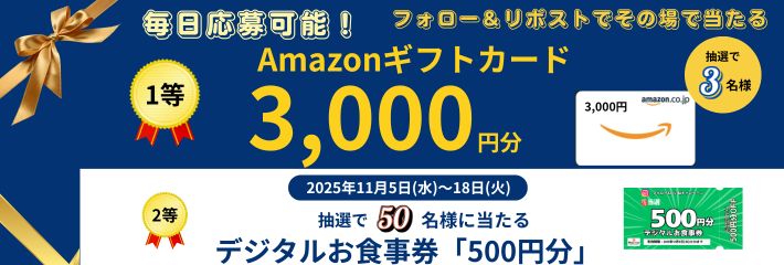 その場でAmazonギフトカード3,000円分が3名様、デジタルお食事券500円分が50名様に当たるXキャンペーンも同時開催!