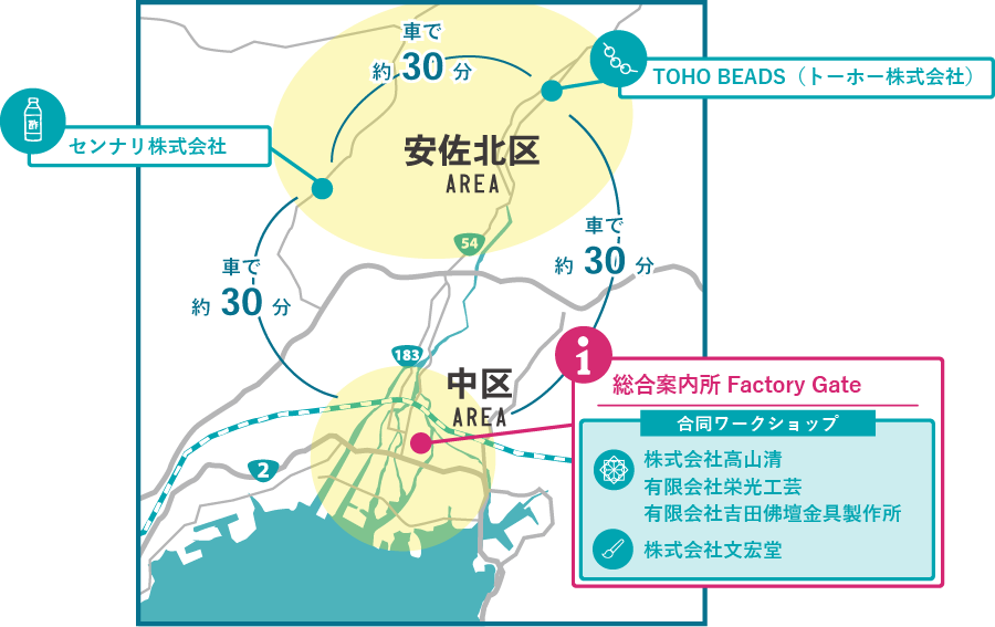 6年の時を経てスケールアップした今回は、初めて安芸エリア(広島市)でも実施します。安芸エリアでは、広島仏壇 や熊野筆 といった伝統工芸から、世界的なグラスビーズメーカー 、地域で愛される食酢 まで、都市近郊で育まれてきた多様なものづくりに取り組む6社が参加します。