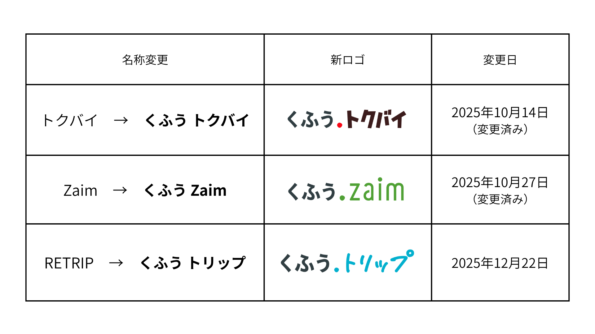 株式会社くふうカンパニー(本社:東京都港区、代表取締役:穐田誉輝、以下「くふうカンパニー」)は、事業拡大およびブランド戦略の一環として、運営するチラシ・買い物情報サービス「トクバイ」、家計簿サービス「Zaim」、旅行・おでかけメディア「RETRIP」のサービス名称を以下のとおり変更することをお知らせいたします。