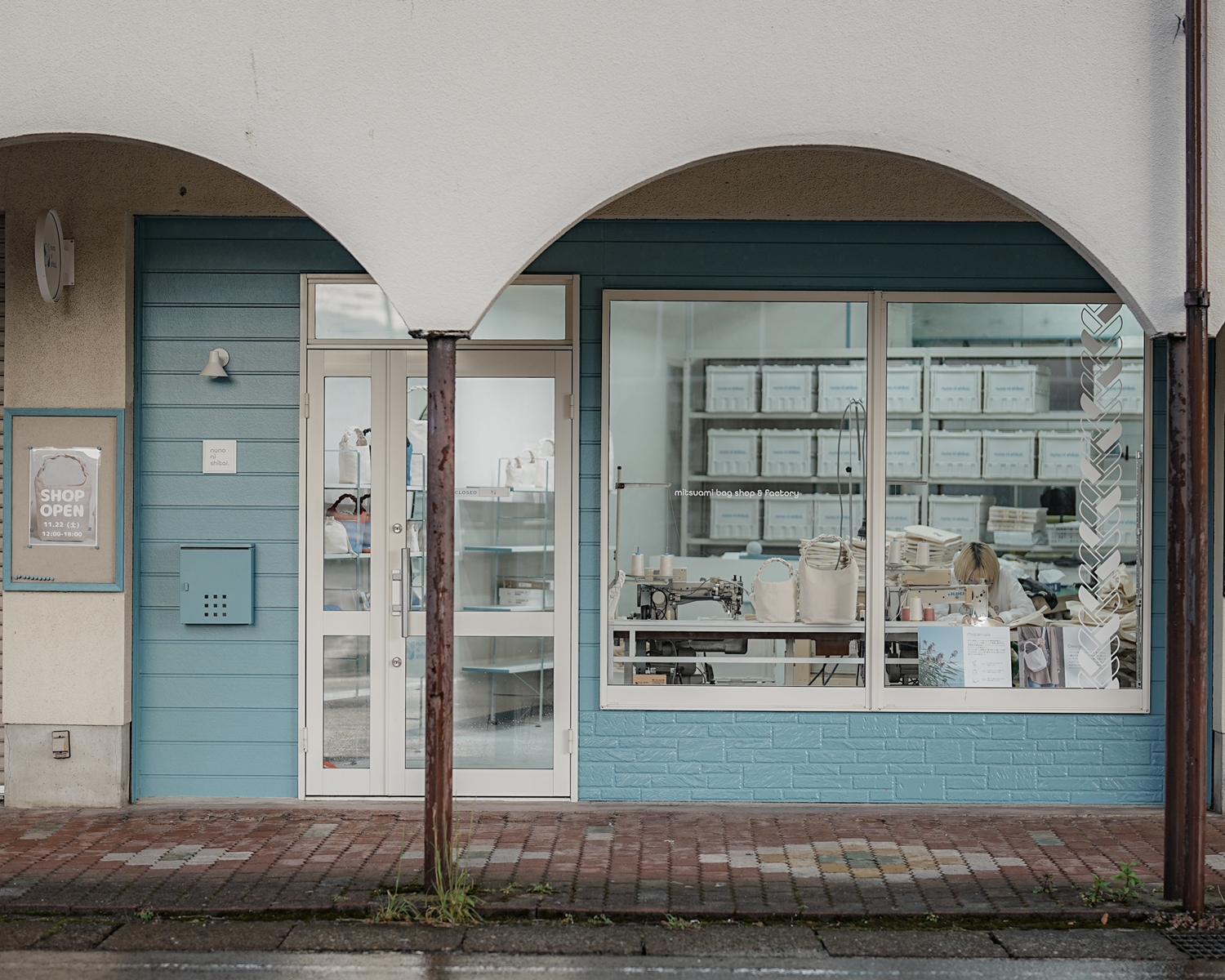 JR湖西線 近江今津駅からローラン名小路商店街を抜けた直ぐのアクセスしやすい場所です。大きなガラス窓で、通りからも店内がみえます。実店舗がなかったことから「実物を見たい」という声にお応えし、店舗スペースをつくりました。通りからはミシンを踏む制作の様子も見ることができます。 シャッターが目立つ駅前の商店街に往来がうまれることで、少しでも地域が元気になれば、と考えています。