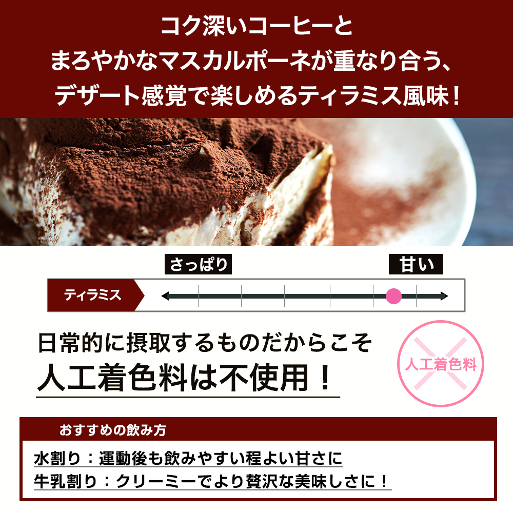 マスカルポーネ感を主張させたクリーミーな味わいにしたことで、飲んだ瞬間にコーヒーの香りに負けないマスカルポーネのやさしい風味を同時に感じられる贅沢なプロテインです。