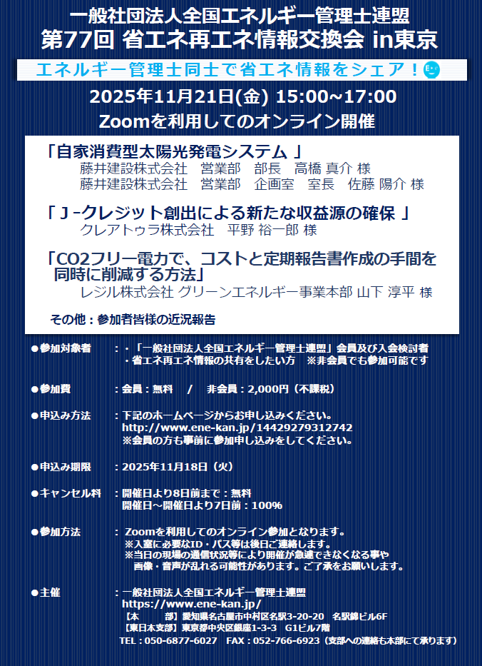 一般社団法人全国エネルギー管理士連盟は「第77回省エネ再エネ情報交換会in東京」を