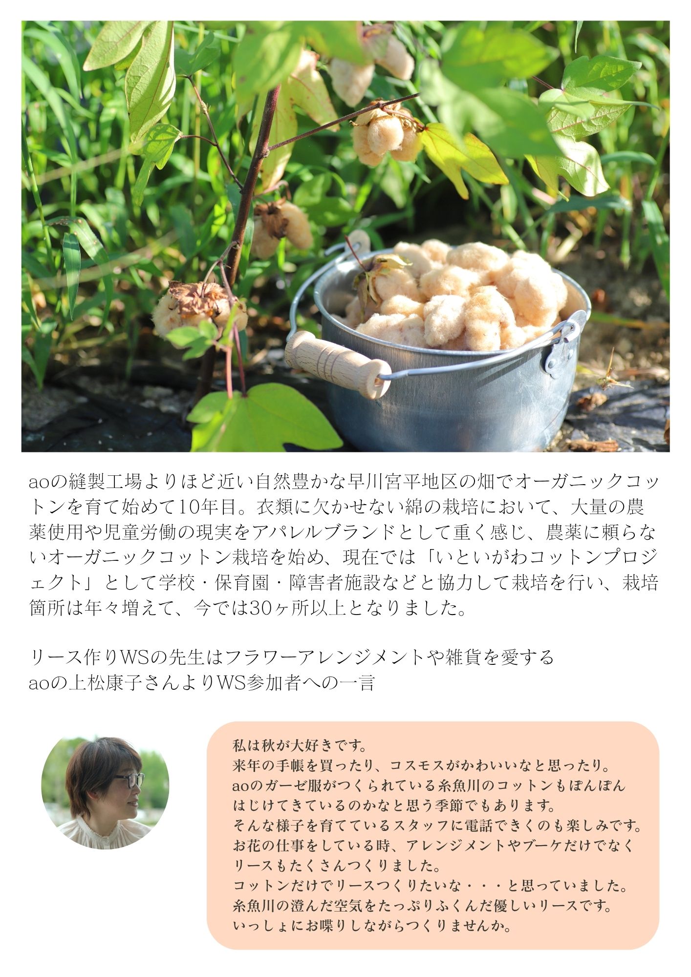 大人も心地よいガーゼ服ブランド【ao】が糸魚川コットンプロジェクトで育てたコットンを使います。クリスマスリースにも!