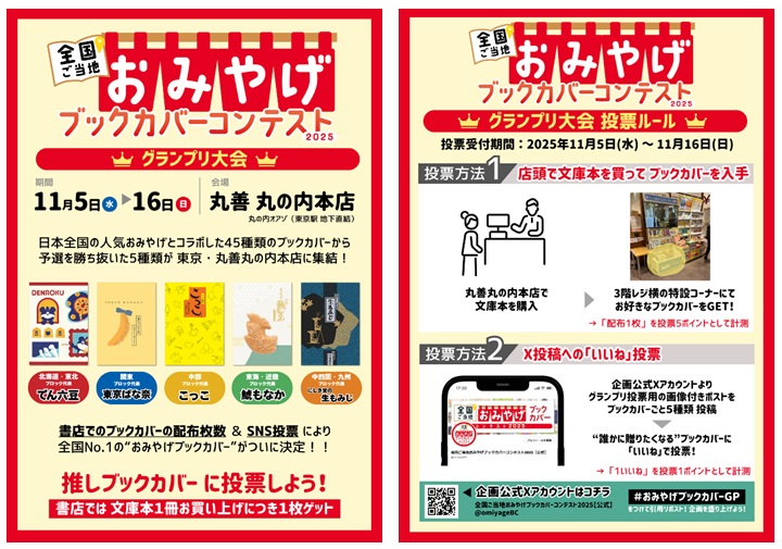 ②SNS投票:「全国ご当地おみやげブックカバーコンテスト」公式Xアカウントに投稿された「グランプリ候補ブックカバー」の中から“誰かに贈りたくなるブックカバー”を選んで「いいね」で投票(いいね1点につき1ポイント) - 結果発表:11月下旬に公式Xアカウントより発表