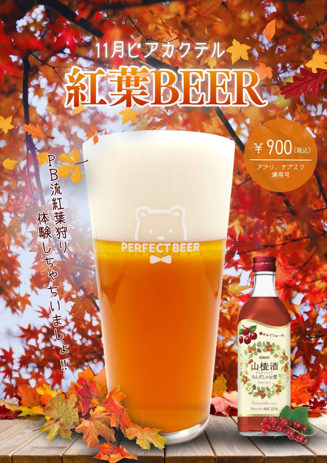 ビールの専門店「PERFECT BEER 」(株式会社 PERFECT BEER )は、2025年11月1日(土)より、11月限定ビアカクテルとして「紅葉BEER」を全国のPERFECT BEER 店舗にて販売いたします! サンザシのフルーティーでほのかな酸味と、ハートランドのすっきりした苦味が重なり合う、秋にぴったりのビアカクテルです。