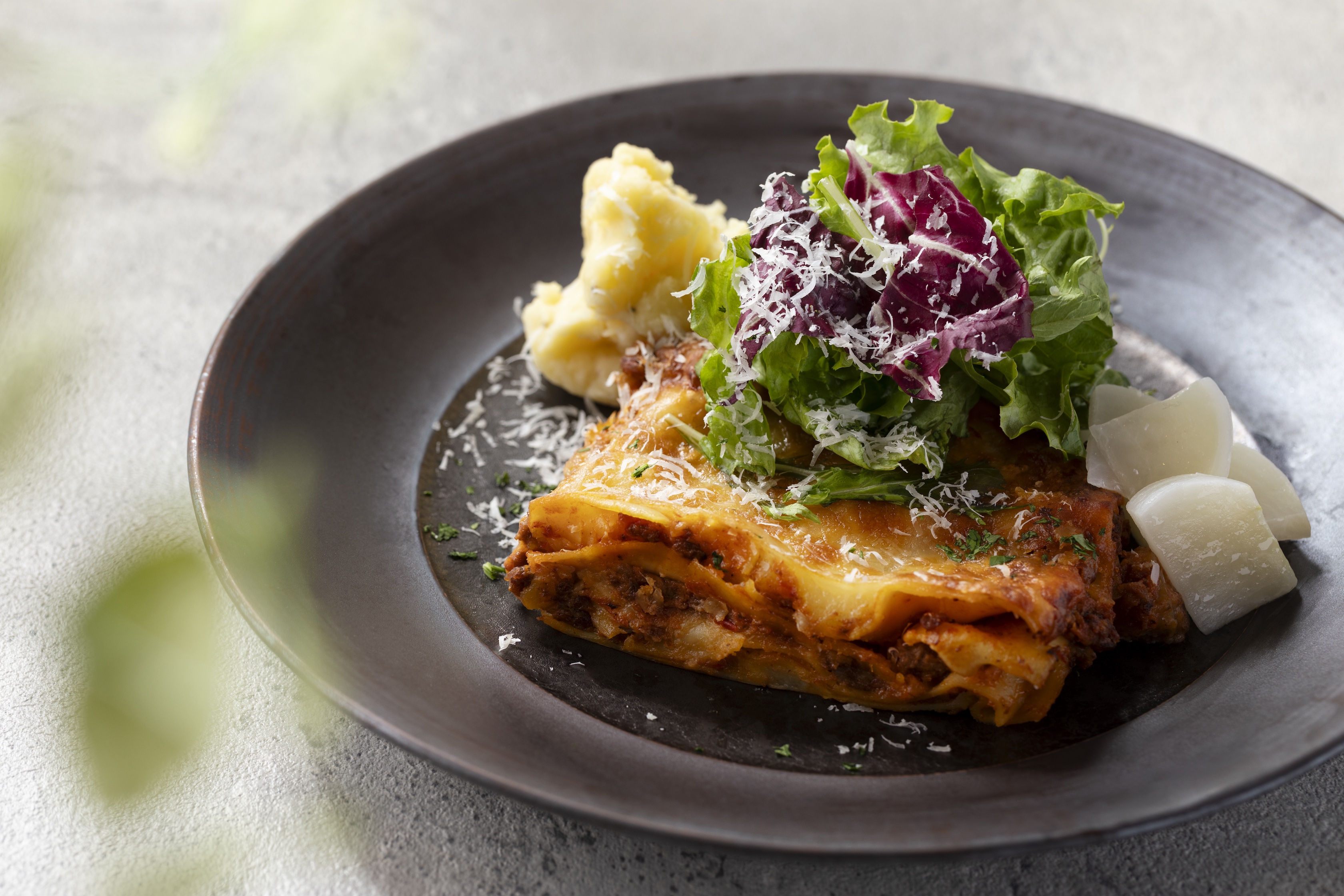 那須塩原市産生乳100%使用「那須塩原牛乳」をたっぷりと使ったベシャメルソースが自慢の、贅沢なラザニア。塩原かぶやレンコンなど、那須塩原市の新鮮野菜をふんだんに使用し、ラザニア生地の間に挟んだレンコンのシャキシャキとした食感がアクセントに。濃厚なミルクの風味と野菜の旨みが調和した、八芳園シェフこだわりの一品です。