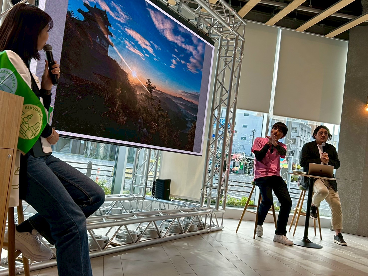 1日目のメインイベントとして実施されたのは、代表作「月と岐阜城」で知られる写真家小林淳氏と「ぎふのこ」や「ノブナガ」のインスタグラムアカウントを活用し、インフルエンサーとして岐阜の魅力を発信する大野光樹氏によるトークショー。「写真家目線 × インフルエンサー目線で見る山県の魅力」をテーマに、撮影の裏話や発信の工夫、地域の魅力をどのように伝えていくかについて語り合うという、岐阜や山県の魅力を再発見できる内容で、来場者は熱心に耳を傾けていた。