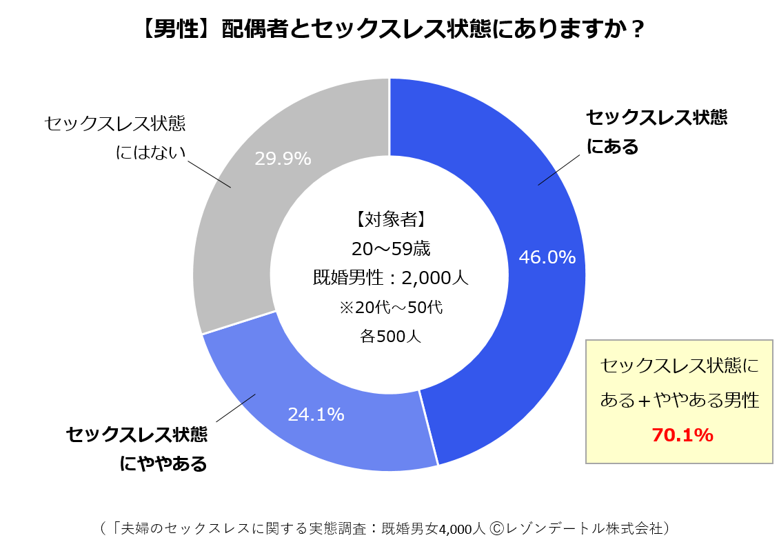 他方、性的な環境においても夫婦間のセックスレスは深刻化しており、「夫婦のセックスレスに関する実態調査 第1報」(ヒールメイト調べ)では、20~50代男性の約70%がセックスレス傾向との結果が示されました。セックスレスは、体だけでなく心の温度も奪います。