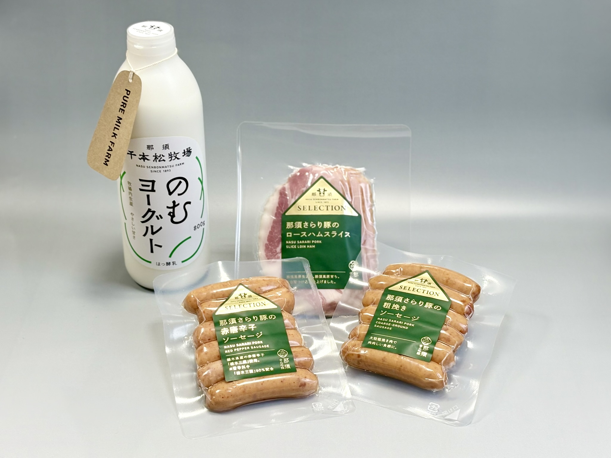 ②ハムセット(さらり豚ロースハムスライス、さらり豚粗挽きソーセージ、さらり豚赤唐辛子ソーセージ、千本松牧場のむヨーグルト、保冷パック)3,400円