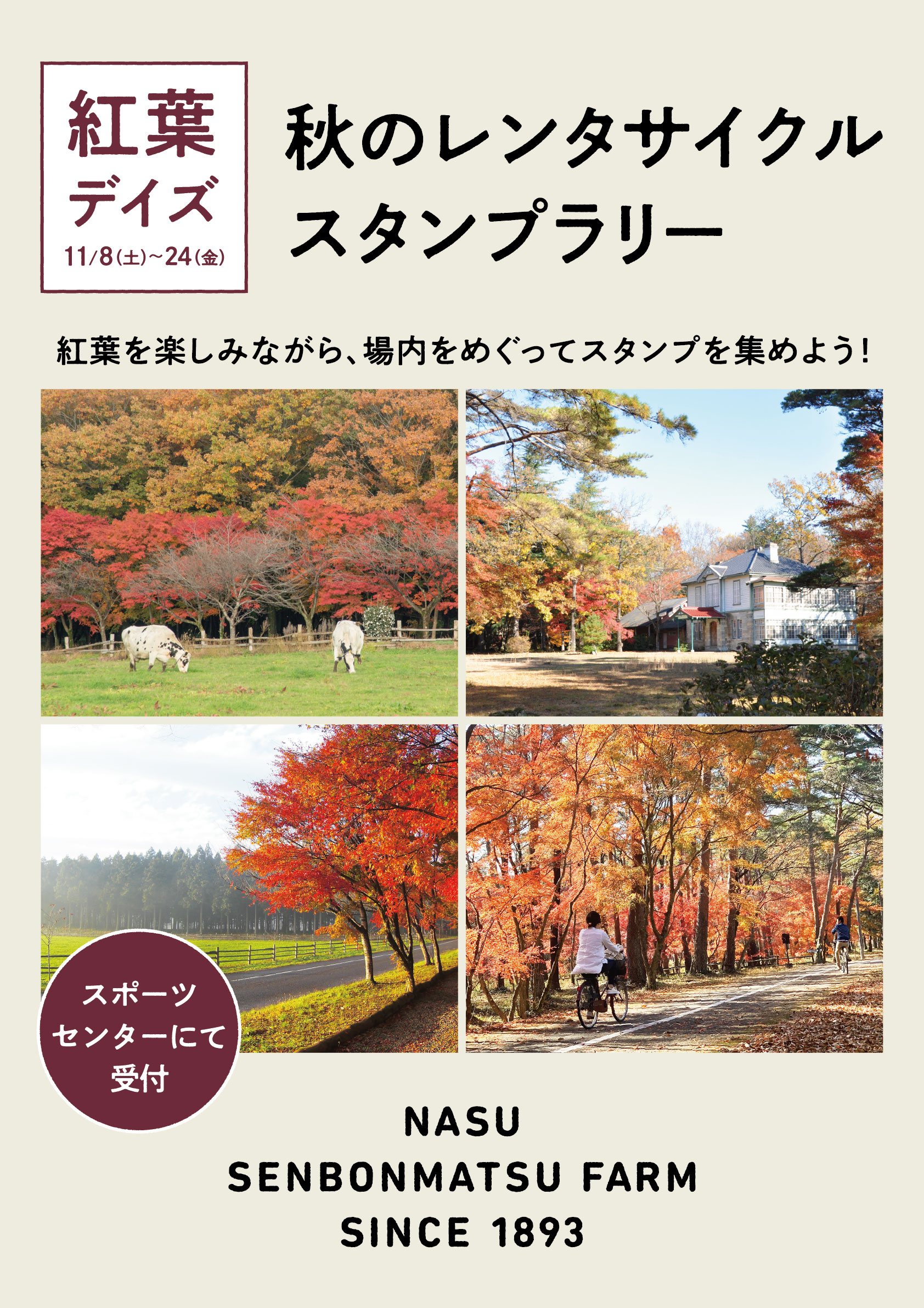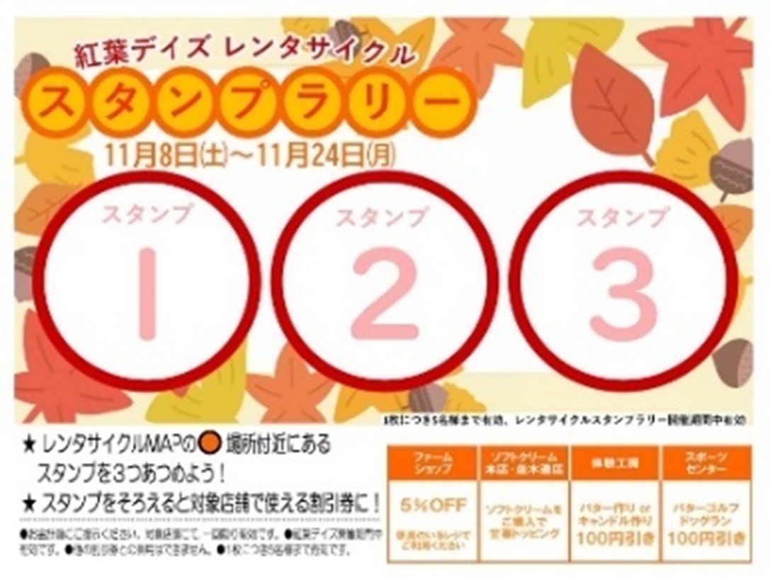 レンタサイクルで牧場内の紅葉スポットを巡り、各所に設置されたスタンプを集めると対象店舗で使えるお得な割引券がもらえます。