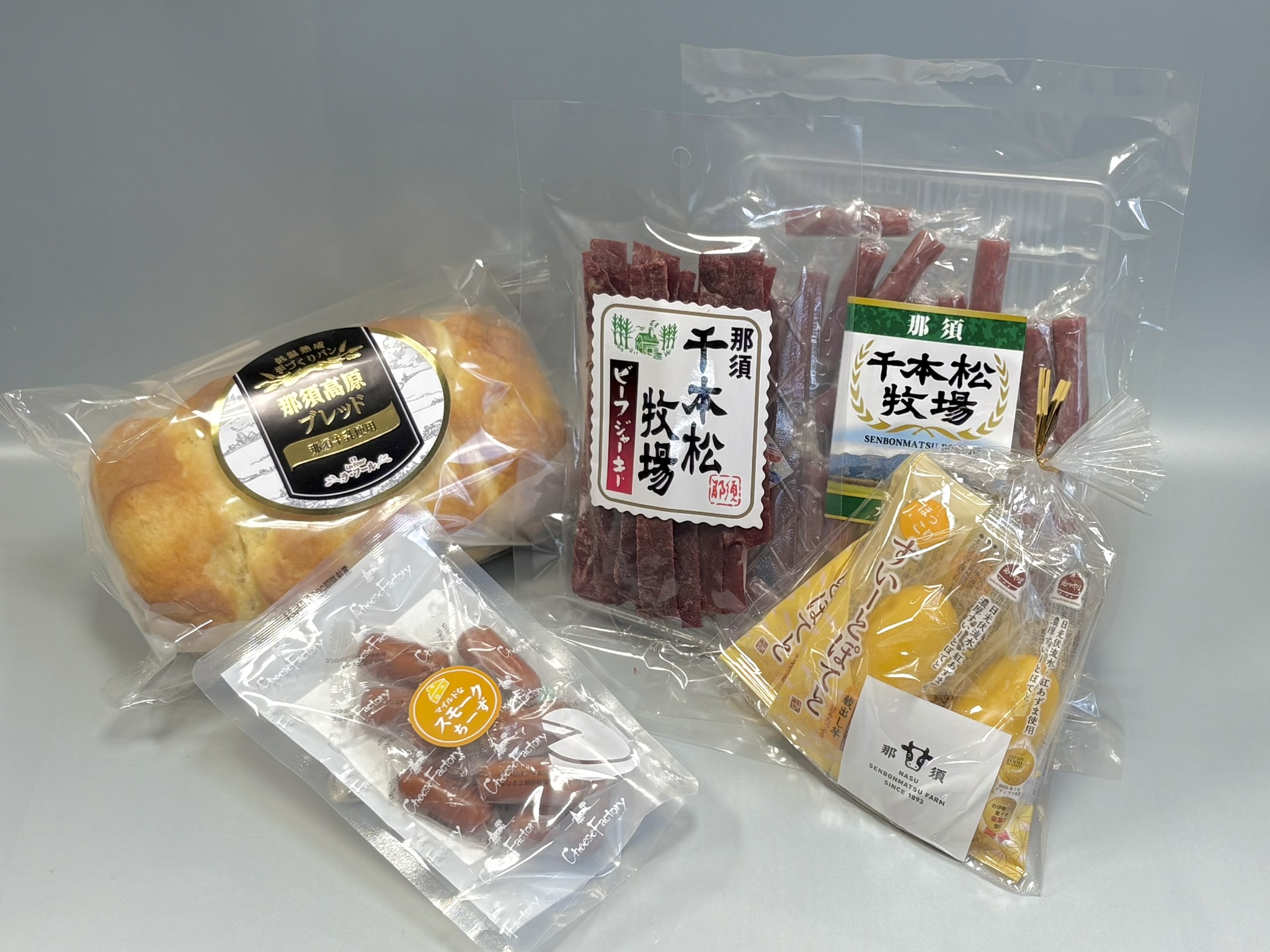 ①おつまみセット(千本松牧場カルパス、ビーフジャーキー、スモークチーズ、那須高原ブレッド、スイートポテト)3,800円