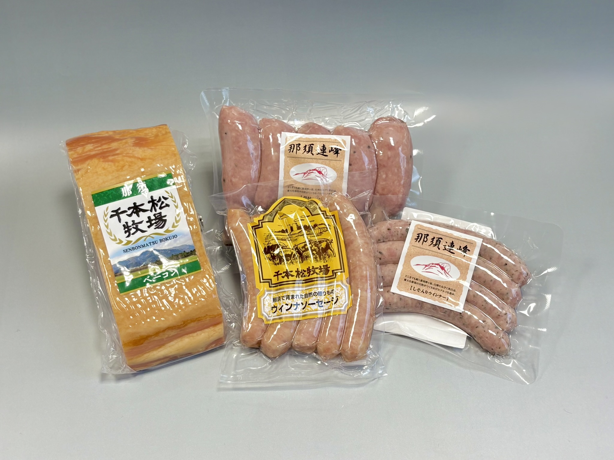 ③焼肉セット(千本松牧場ベーコン、那須連峰骨付フランク、しそウインナー、ウィンナーソーセージ、保冷パック)4,100円